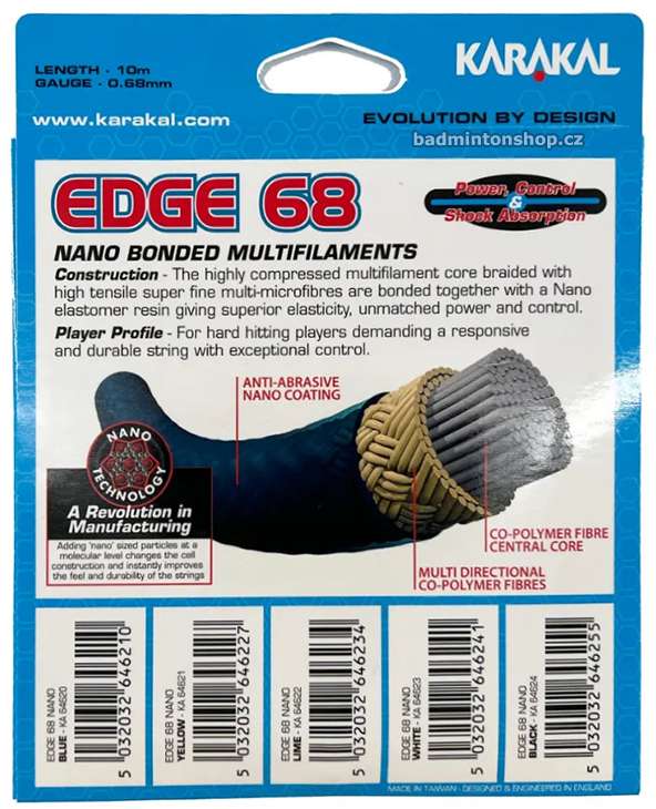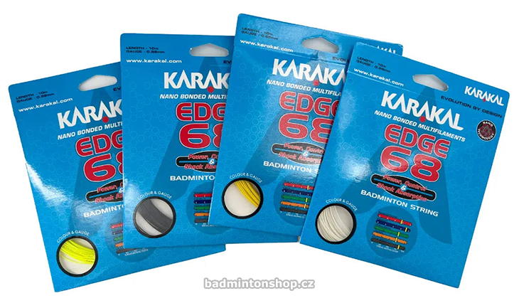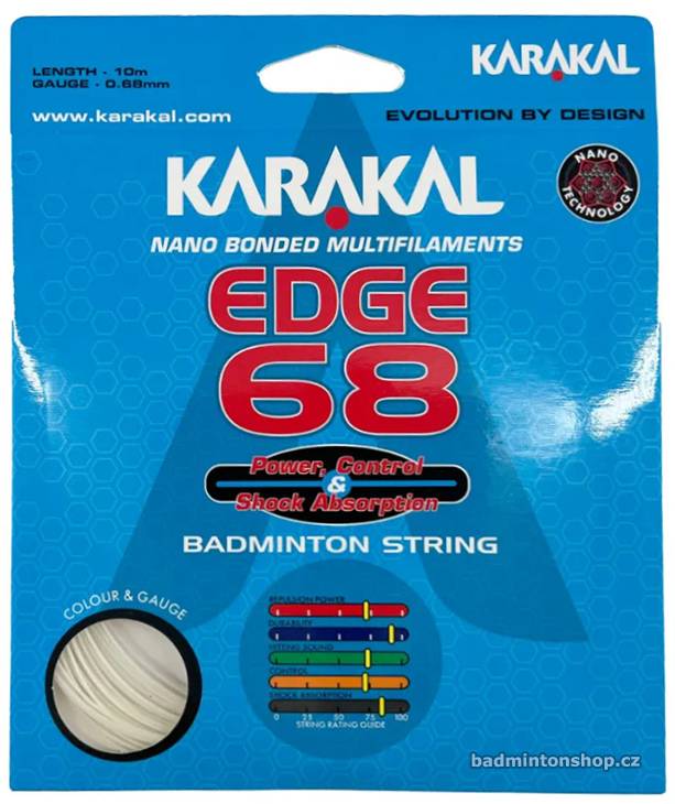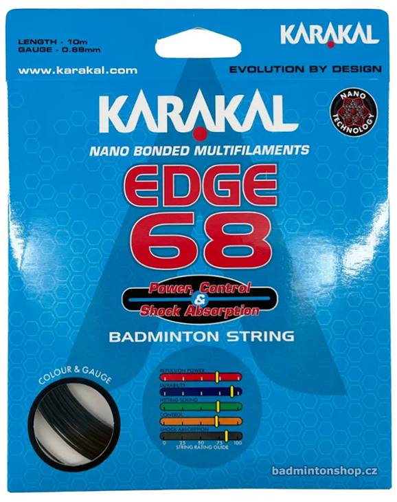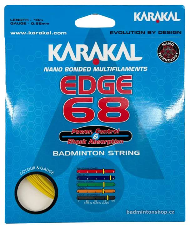 Karakal Edge 68 je syntetická vícevláknová badmintonová struna s nanovlákny. Multifilamentní jádro je silně stlačené a opletené vysoce pevnými a velmi jemnými multivlákny. Celá struna je pak potažena nano-elastomerovou pryskyřicí, která jí dodává vynikající pružnost s bezkonkurenční silou a kontrolou. Výplet má střední průměr struny 0,68 mm a je nabízen v pěti různých barvách.